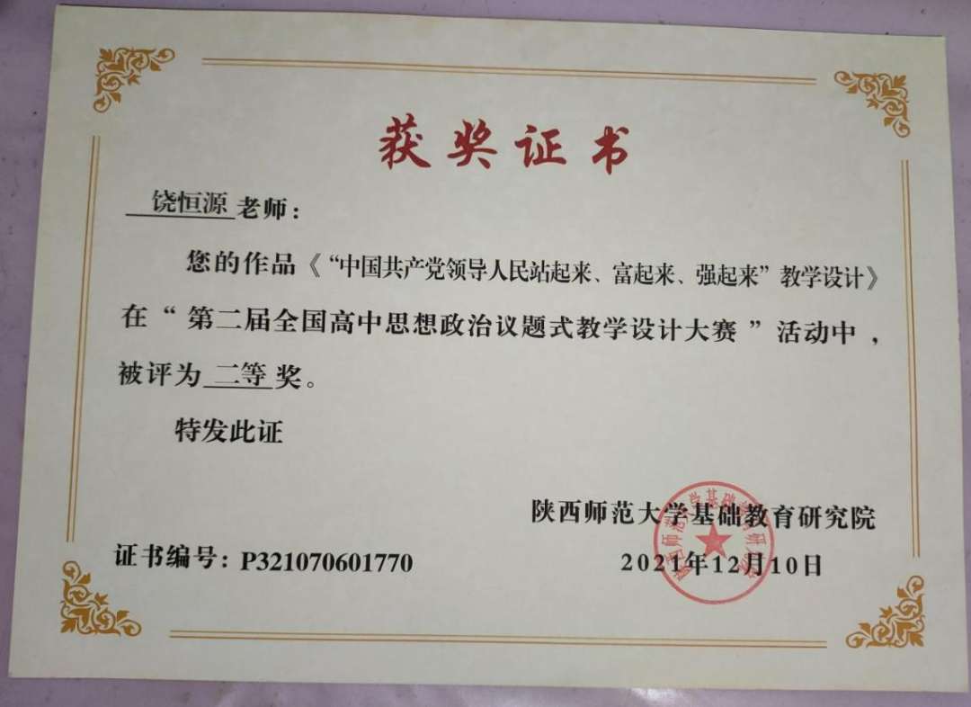4.2021年12月荣获第二届全国高中思想政治议题式教学设计大赛“二等奖”;