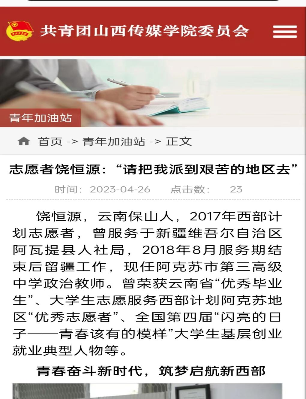 2017年,饶恒源从云南大学旅游文化学院毕业后,积极响应“到西部去”的号召,报名参加大学生志愿服务西部计划。他横跨6000公里,历经 64 小时车程,从昆明奔赴新疆阿克苏地区阿瓦提县——这个地处南疆深度贫困区的边疆小城,成为他践行初心的第一站。面对艰苦环境,他主动选择到条件最艰苦的南疆服务,用行动诠释 “党有所需,我有所为”的担当。