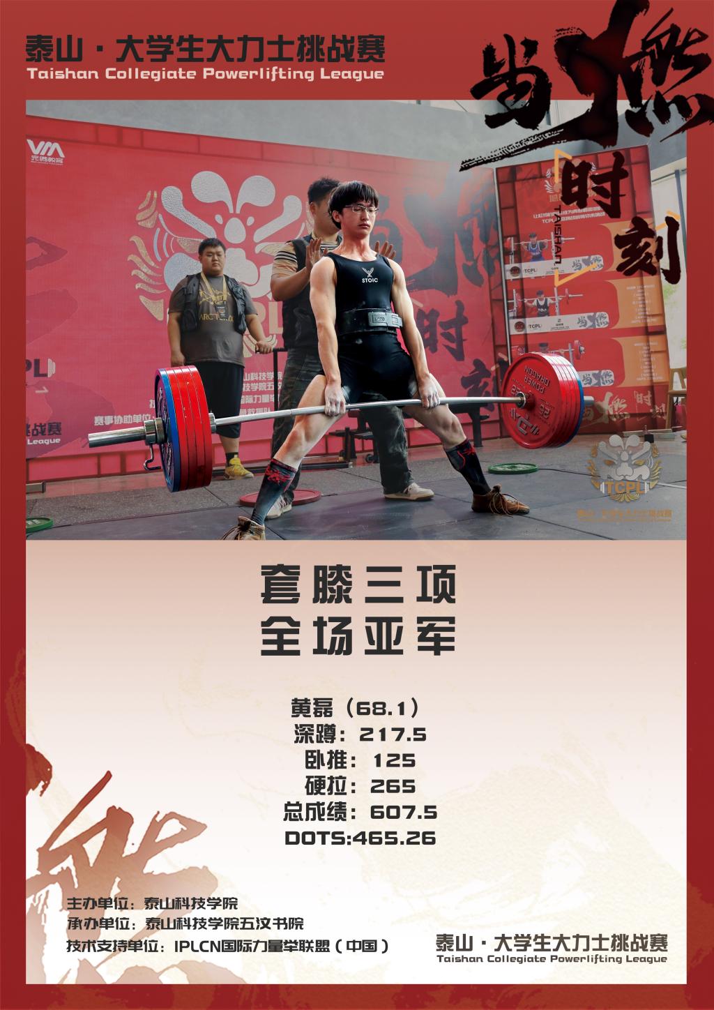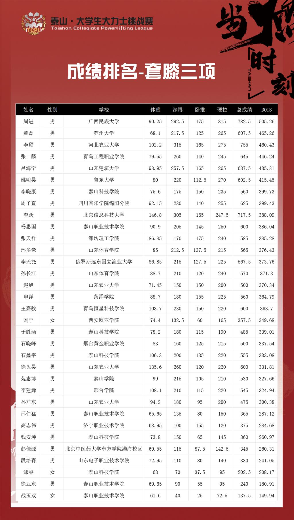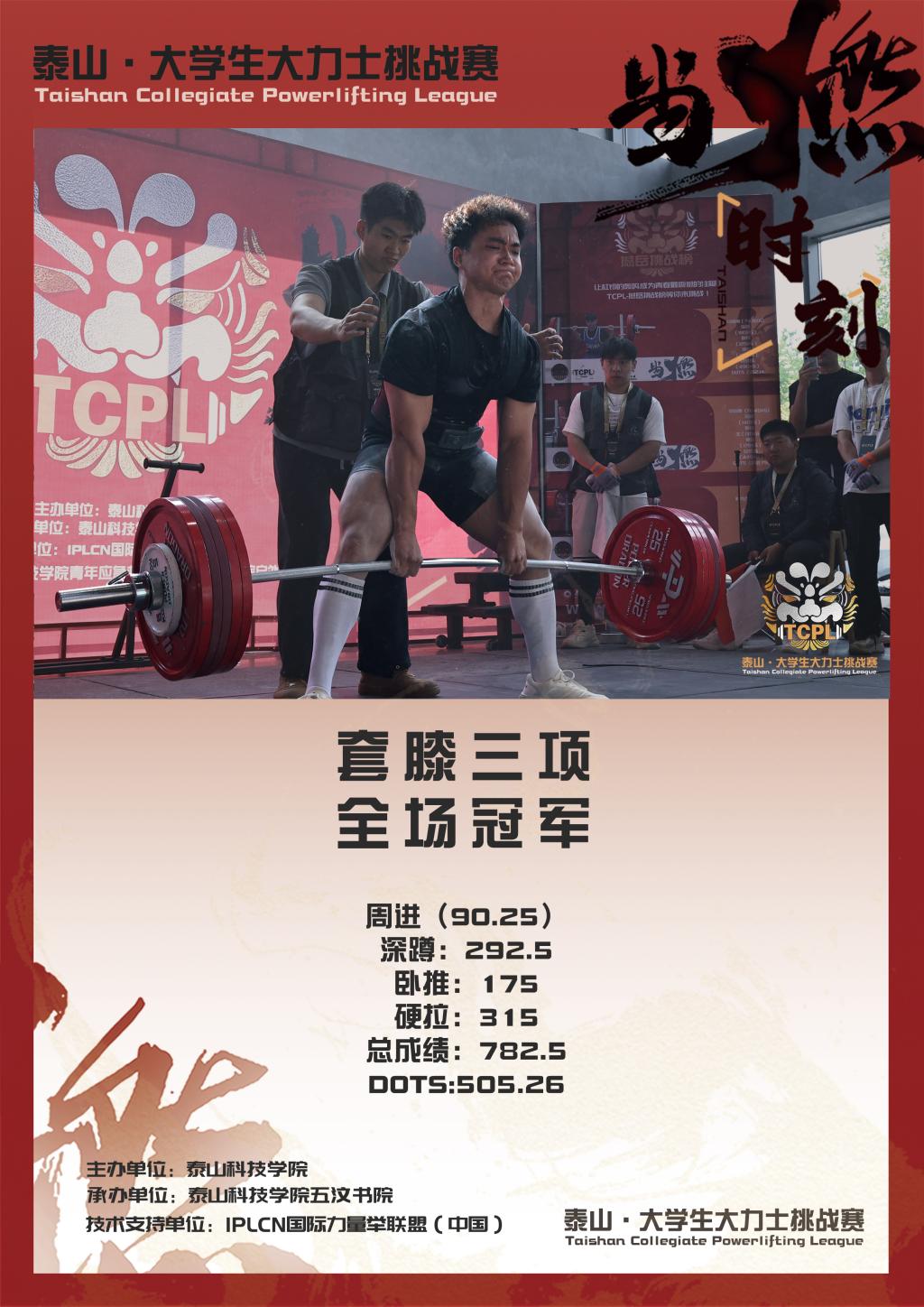5月25日,由泰山科技学院主办、五汶书院承办的TCPL2025泰山·大学生大力士挑战赛在泰山之巅圆满收官。本次赛事获IPL国际力量举联盟(International Powerlifting League)全程技术支持,吸引了来自亚洲3个国家、21个省级行政区70所高校的选手参与。经过激烈角逐,45名晋级决赛的选手以热血与力量诠释青春风采,最终广西民族大学周进、苏州大学黄磊、河北农业大学李硕分获冠亚季军,刷新赛事DOTS纪录。