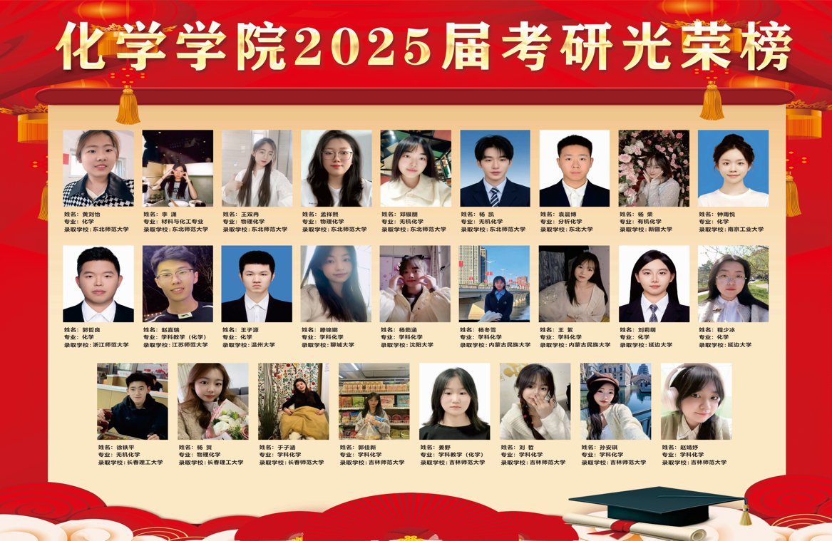 (新闻网讯 化学学院报道)当夏日的微风轻拂校园,化学学院迎来令人振奋的喜讯!随着2025年全国硕士研究生招生录取工作圆满收官,化学学院2025届考研学子交出了一份亮眼答卷,26名学生成功叩开理想学府大门,以实力书写绚烂的青春篇章。