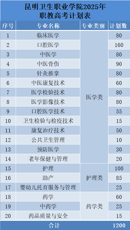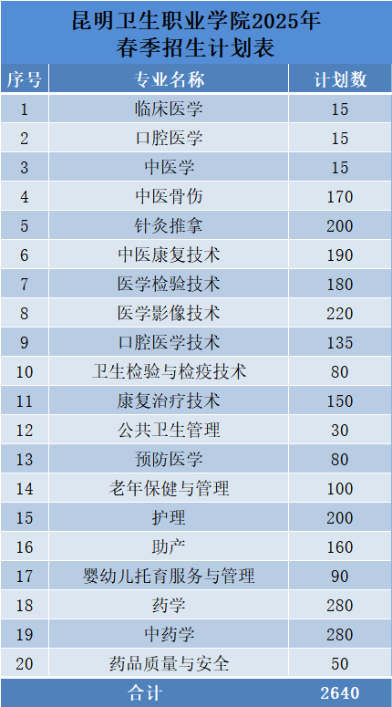 昆明卫生职业学院2025年春季招生、职教高考招生计划