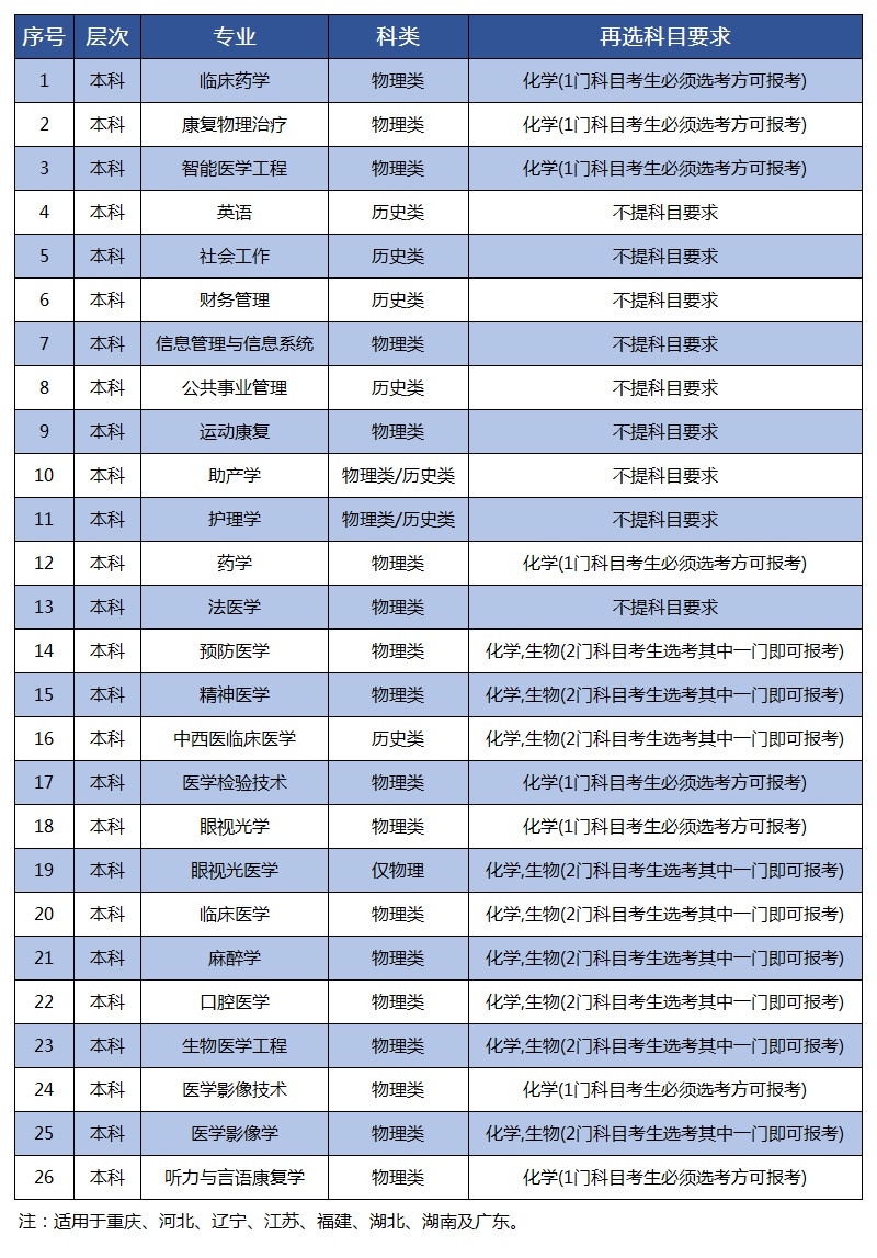 川北医学院2022年高考改革省份选考科目要求(3+1+2模式)