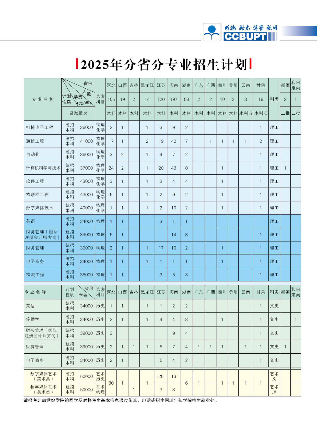 北京邮电大学世纪学院2025年分省分专业招生计划