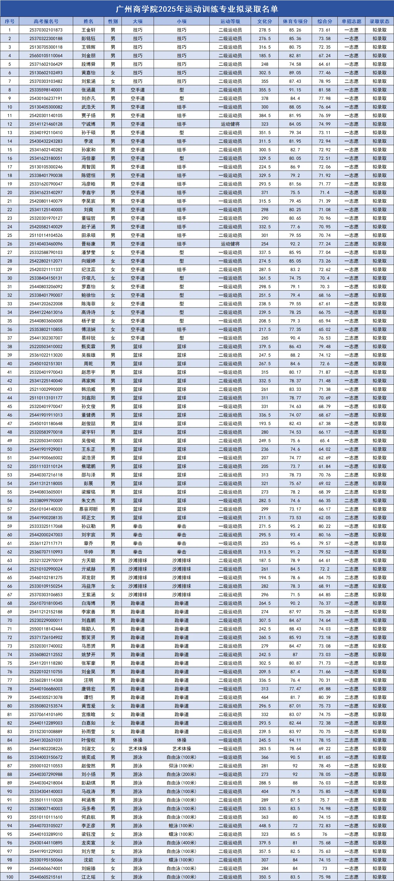 二、广州商学院2025年运动训练专业拟录取名单详见下表,公示期为2025年5月28日-6月3日。如有异议请于公示期内以实名方式据实反馈,逾期不予受理。拟录取名单须经国家体育总局、考生所在省份省级招生主管部门审核备案通过方可确定录取资格。