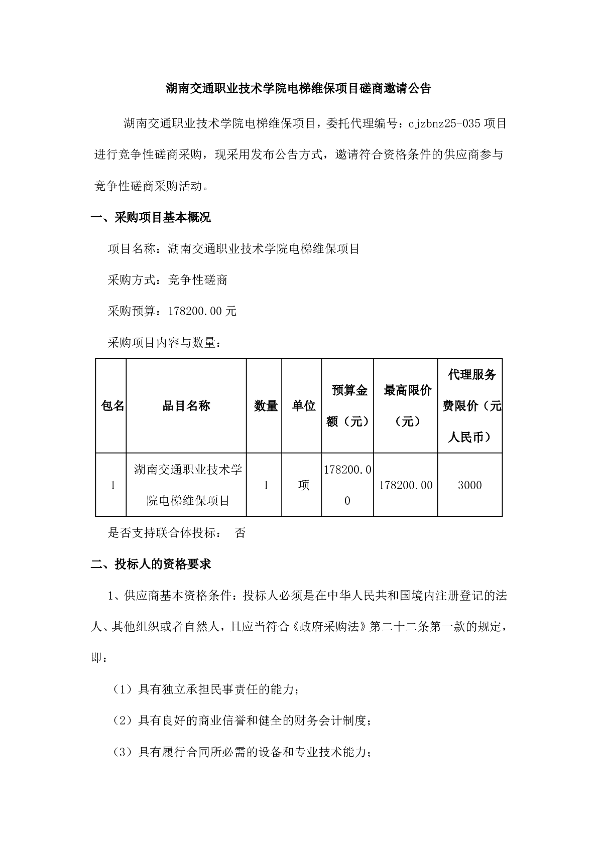 湖南交通职业技术学院电梯维保项目磋商邀请公告