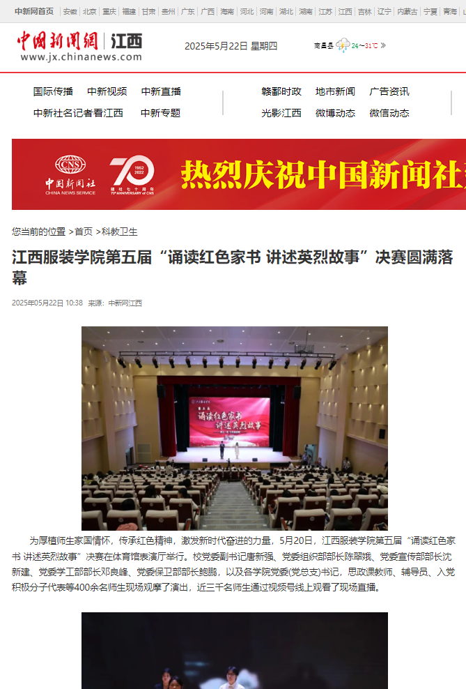 为厚植师生家国情怀,传承红色精神,激发新时代奋进的力量,5月20日,江西服装学院第五届“诵读红色家书 讲述英烈故事”决赛在体育馆表演厅举行。校党委副书记唐新强、党委组织部部长陈翠娥、党委宣传部部长沈新建、党委学工部部长邓良峰、党委保卫部部长鲍鹏,以及各学院党委(党总支)书记,思政课教师、辅导员、入党积极分子代表等400余名师生现场观摩了演出,近三千名师生通过视频号线上观看了现场直播。