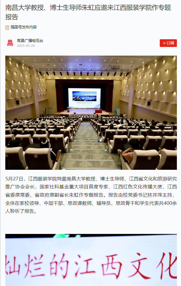 5月27日,江西服装学院特邀南昌大学教授、博士生导师,江西省文化和旅游研究推广协会会长,国家社科基金重大项目首席专家,江西红色文化传播大使,江西省委原常委、省政府原副省长朱虹作专题报告。报告由校党委书记林井萍主持,全体在家校领导,中层干部、思政课教师、辅导员、思政骨干和学生代表共400余人聆听了报告。