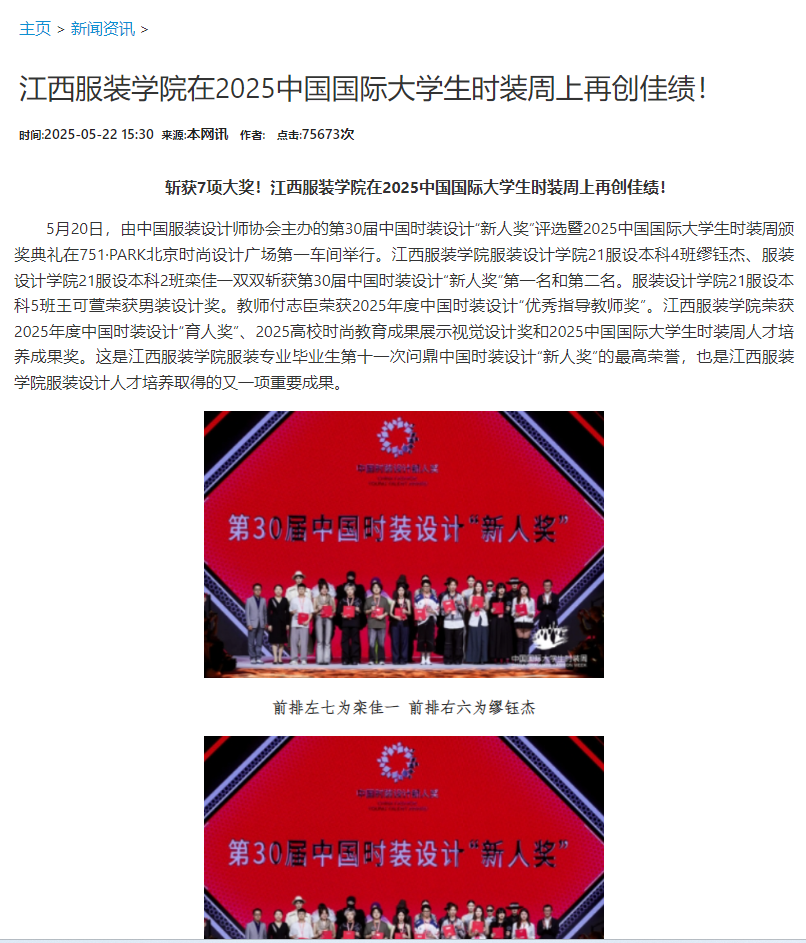 5月20日,由中国服装设计师协会主办的第30届中国时装设计“新人奖”评选暨2025中国国际大学生时装周颁奖典礼在751·PARK北京时尚设计广场第一车间举行。江西服装学院服装设计学院21服设本科4班缪钰杰、服装设计学院21服设本科2班栾佳一双双斩获第30届中国时装设计“新人奖”第一名和第二名。服装设计学院21级服设本科5班王可萱荣获男装设计奖。教师付志臣荣获2025年度中国时装设计“优秀指导教师奖”。江西服装学院荣获2025年度中国时装设计“育人奖”、2025高校时尚教育成果展示视觉设计奖和2025中国国际大学生时装周人才培养成果奖。这是江西服装学院服装专业毕业生第十一次问鼎中国时装设计“新人奖”的最高荣誉,也是江西服装学院服装设计人才培养取得的又一项重要成果。