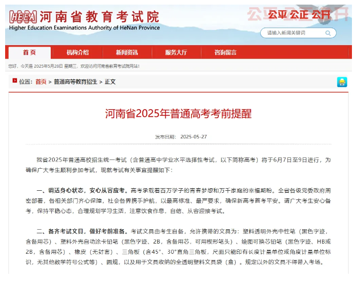 我省2025年普通高校招生统一考试(含普通高中学业水平选择性考试,以下简称高考)将于6月7日至9日进行,为确保广大考生顺利参加考试,现就考试有关事宜提醒如下: