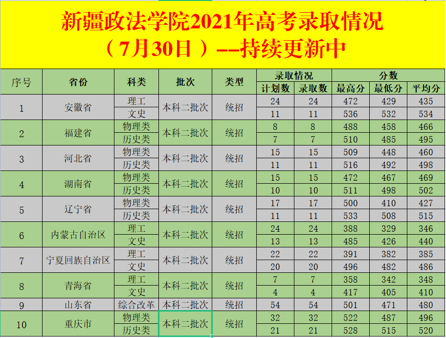 新疆政法学院2021年高考录取情况 (7月30日)--持续更新中