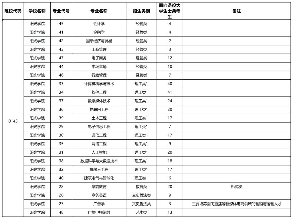 2024年阳光学院专升本面向退役士兵大学生征求志愿计划