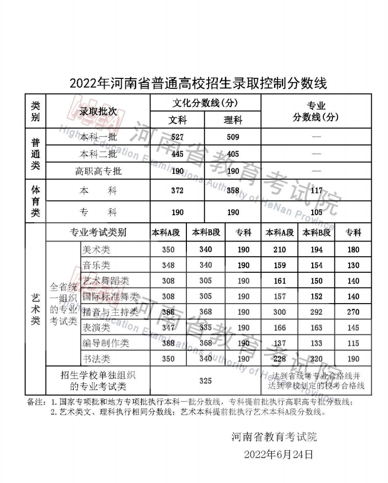 2022年河南省普通高校招生录取控制分数线