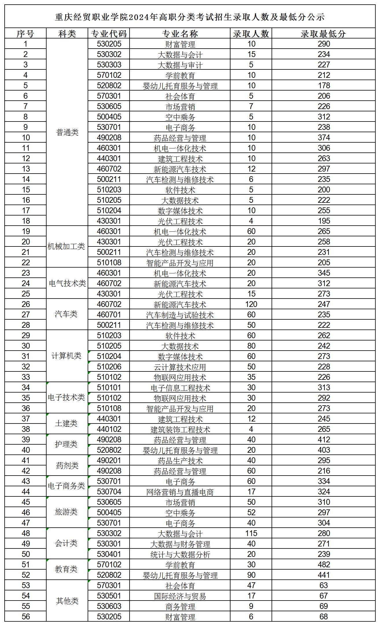 重庆经贸职业学院2024年高职分类考试招生录取人数及最低分公示