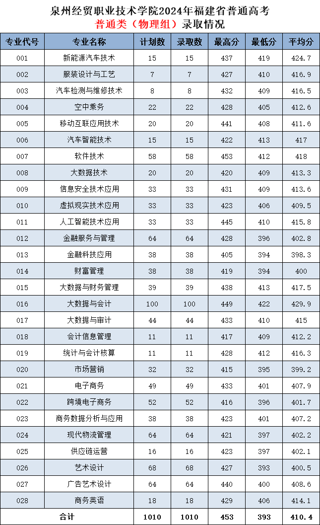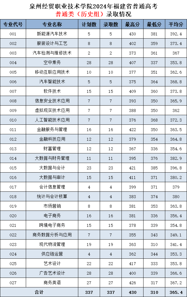 泉州经贸职业技术学院2024年福建省普通高考高职(专科)批普通类录取情况表
