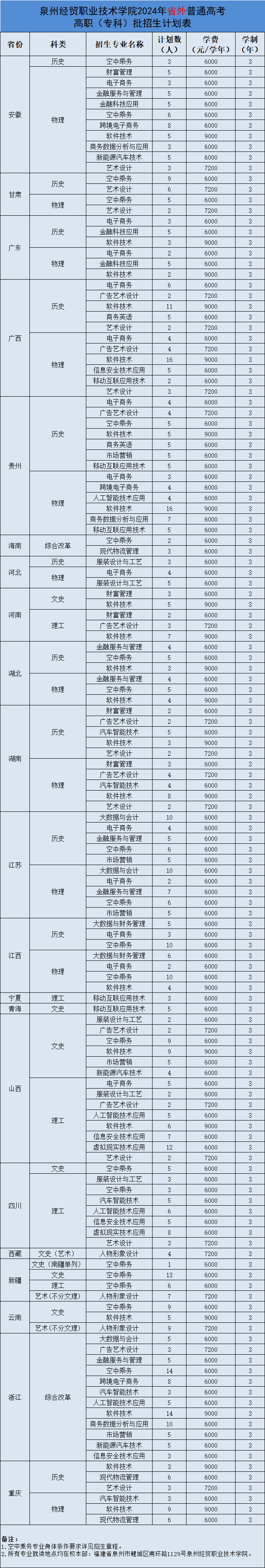 2024年泉州经贸职业技术学院省外普通高考高职(专科)批招生计划表