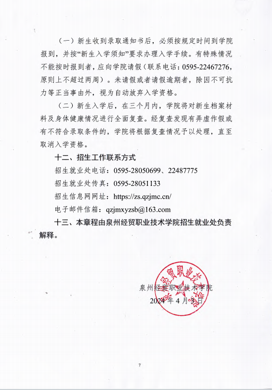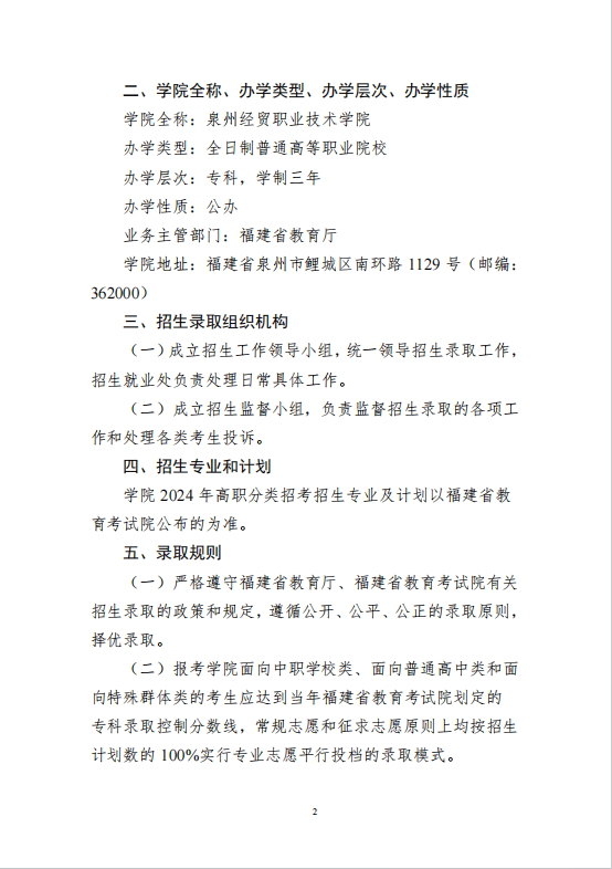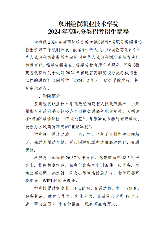 泉州经贸职业技术学院2024年高职分类招考招生章程