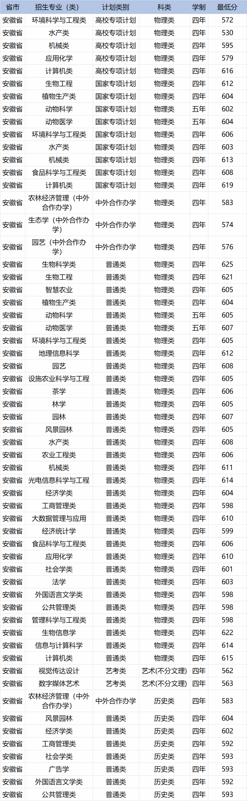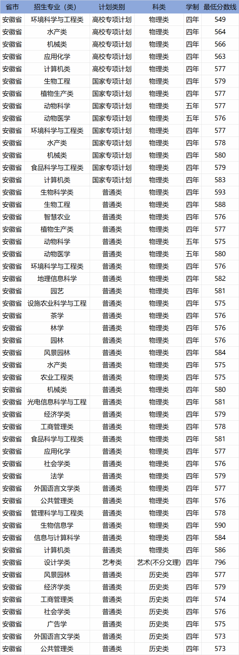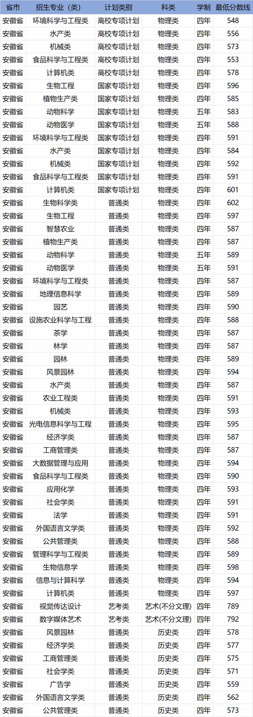 华中农业大学2023年安徽省分专业分数线