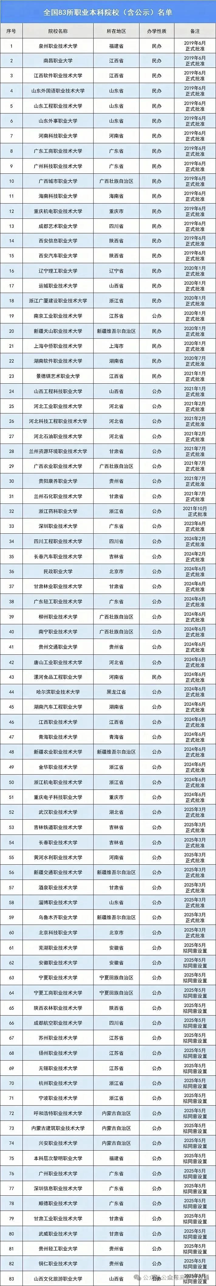 从区域分布数量看,现有的83所职业本科院校(含公示)中,广东省数量最多,共7所;其次为浙江省和甘肃省,各有6所。从办学性质看,公办性质的院校60所,民办性质院校23所。83所职业本科院校(含公示)详细信息如下: