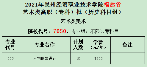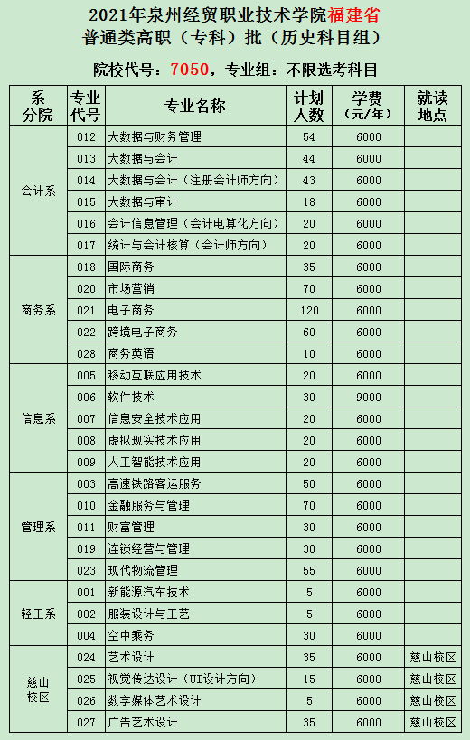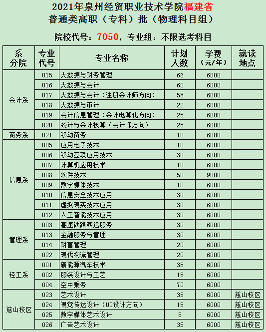 2021年泉州经贸职业技术学院夏季福建省高职(专科)批招生专业计划及代号表