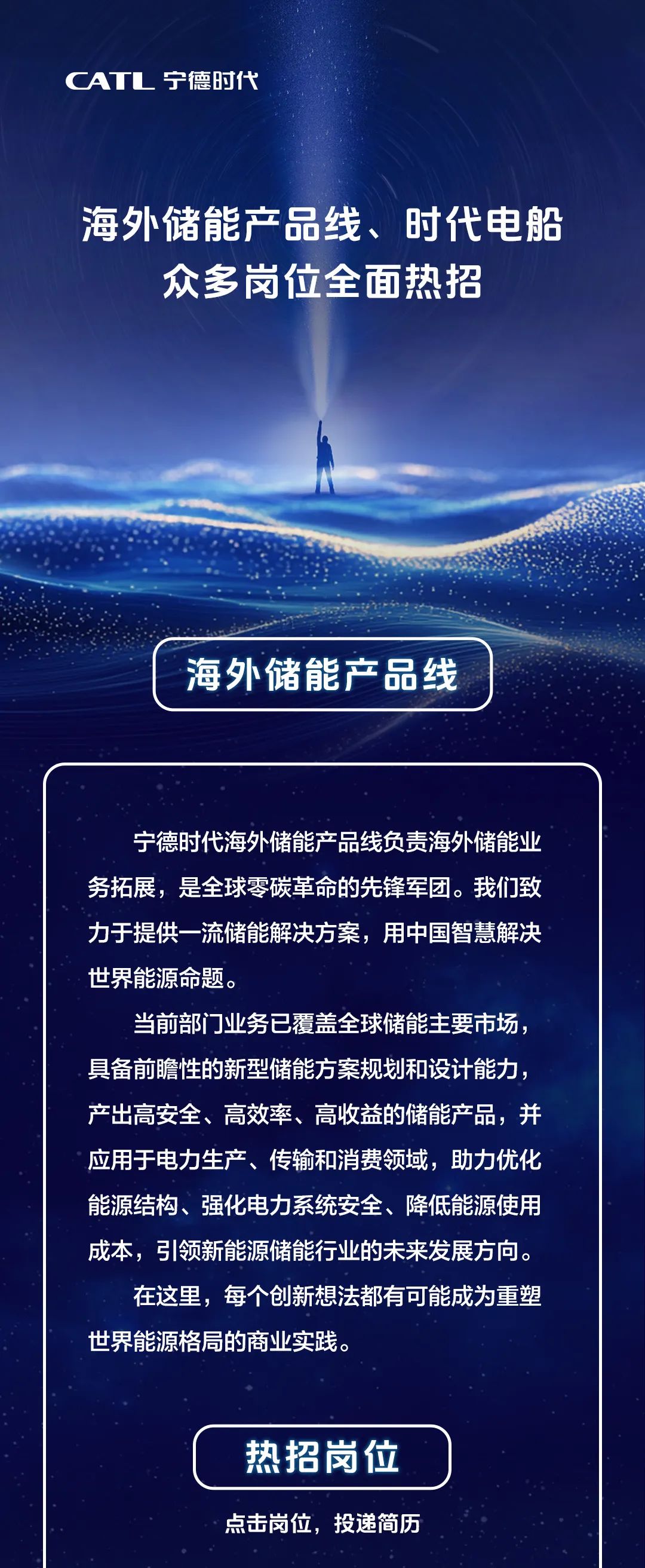 宁德时代海外储能产品线、时代电船岗位热招中,欢迎投递!