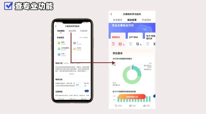 也可以使用优志愿app-【查专业】功能,上面不仅清楚地列举了专业的培养目标、主要课程、考研方向等基本信息,还能知道该专业毕业生们的主要去向,结合各大招聘网站求职市场的招聘情况,了解专业在市场上的人才需求,学历要求,薪资范围等,帮助考生更科学合理地规划未来职业生涯。
