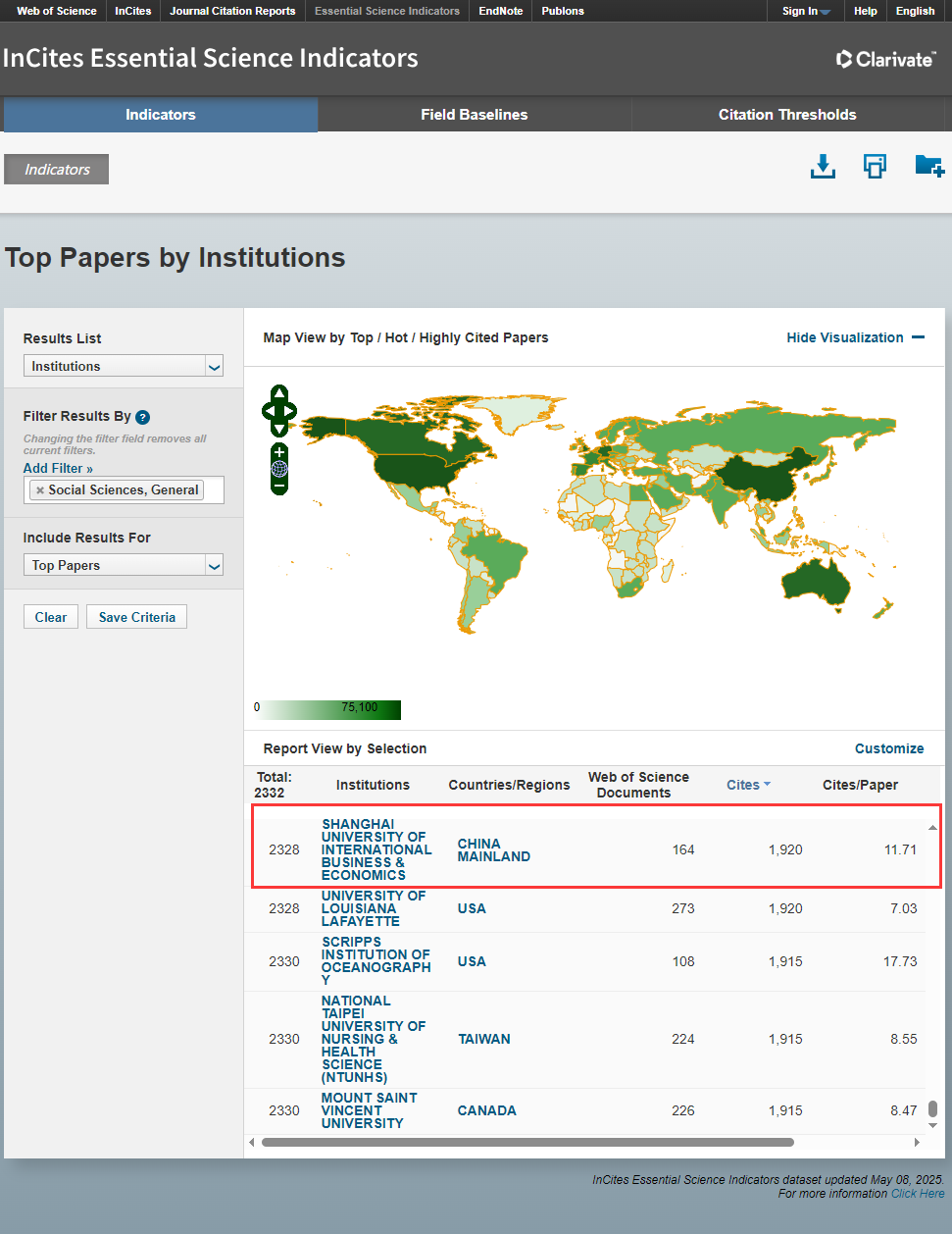 据科睿唯安(Clarivate Analytics)2025年5月最新发布的ESI(Essential Science Indicators)数据显示,上海对外经贸大学社会科学(Social Sciences, General)学科进入ESI全球排名前1%,标志着我校社会科学进入国际高水平学科行列。