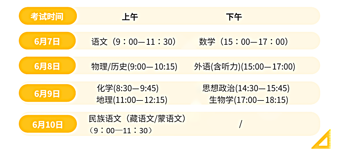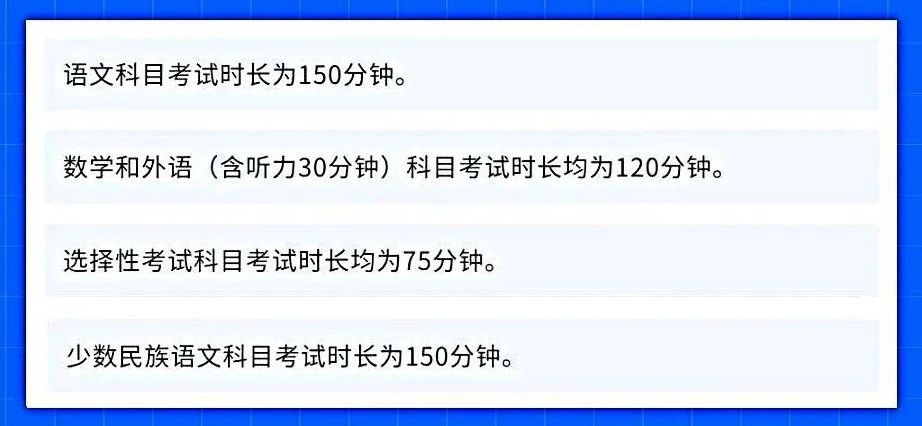 2025年甘肃省普通高校招生统一考试考试时间安排考试时间:6月7日——6月10日各科目具体考试时间各科目考试时长统一高考科目考试时间以教育部公布为准,如有调整,选择性考试科目和民族语文科目的考试安排将相应调整。来源:甘肃省教育考试院