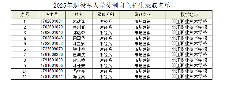各位考生: 我校2025年自主招生(退役军人现代学徒制专项试点)录取工作已结束,经广东省招生办公室审核备案,现将相关录取结果公布如下: 阳江职业技术学院招生办 2025年6月4日 撰稿:肖云湘 校对:肖云湘 审核:杜菁锋
