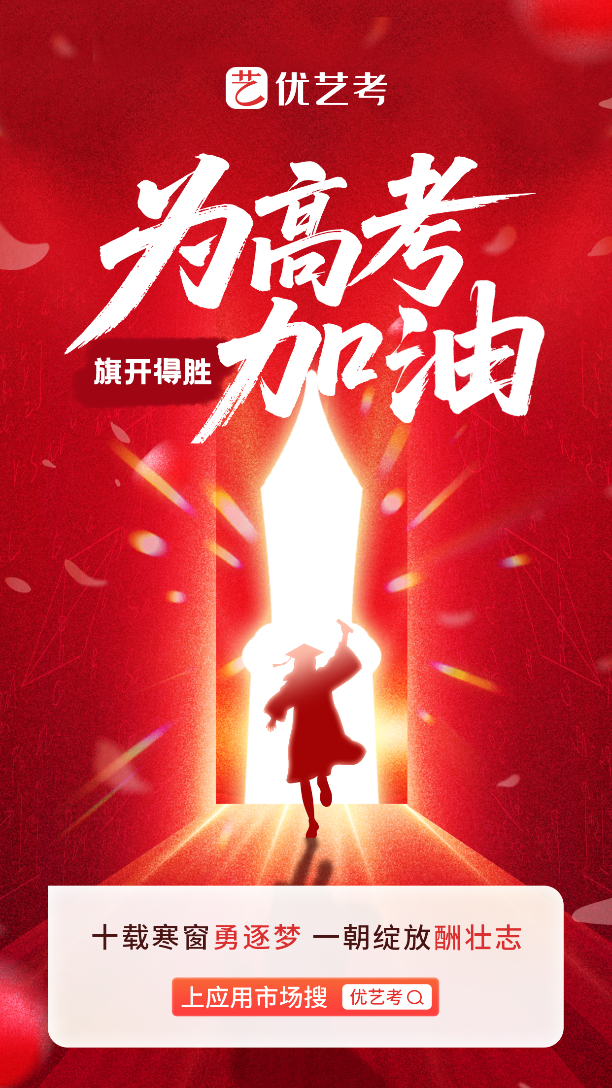 十载寒窗,是汗水与倔强铸就的辉煌征程!如今,高考的号角吹响,优艺考一路相伴,与你们并肩作战!愿你们以梦为马,不负韶华,旗开得胜,金榜题名,向着梦想的彼岸奋勇前行!