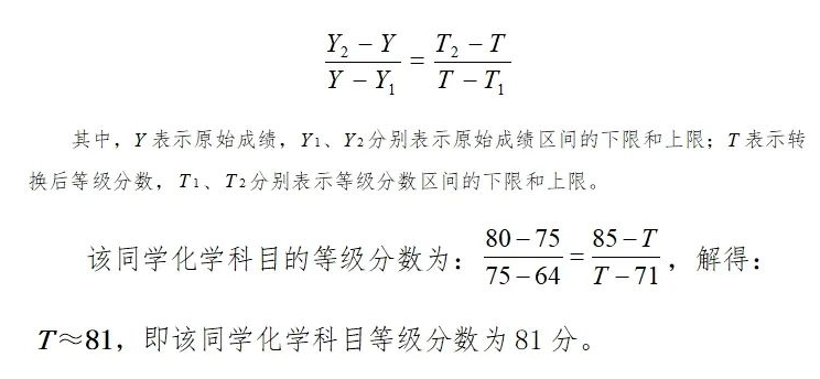 例如,某同学化学科目原始成绩为75分,按照原始成绩排序,等级比例应划分到B等级,而该科目B等级的原始成绩分布区间为80~64,等级分数区间为85~71,按照转换公式: