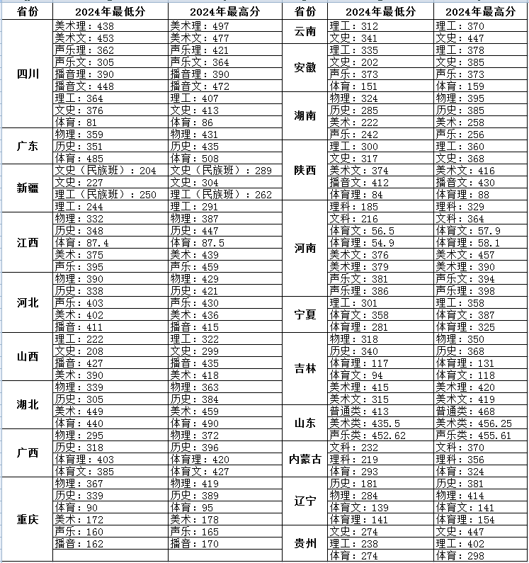 2024年招生省份(黑龙江省除外)最低录取分数线及录取最高分