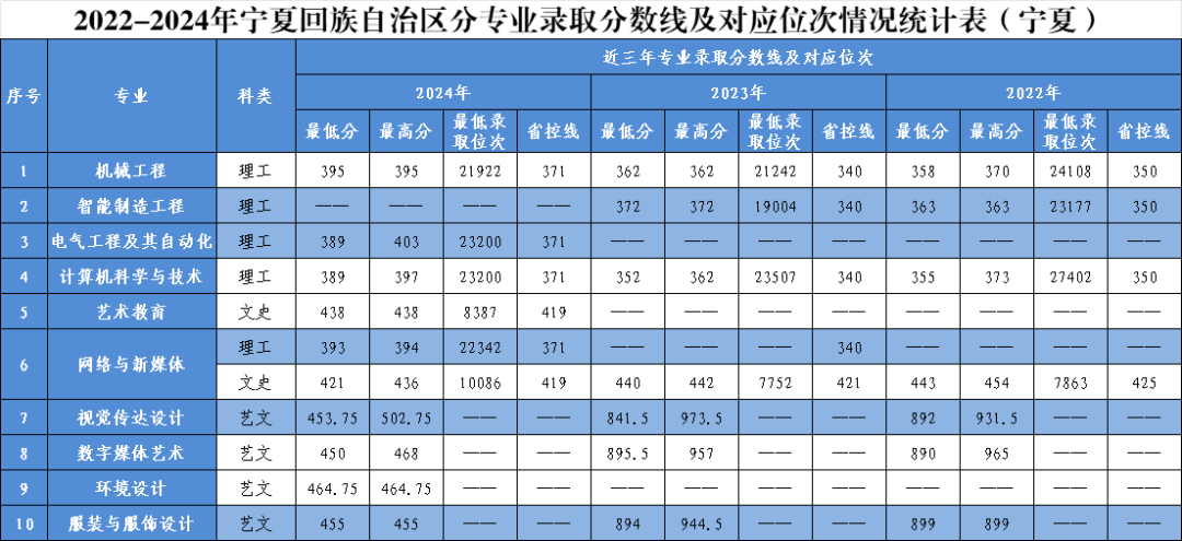 本期带来我校《2022-2024年宁夏回族自治区分专业录取分数线及对应位次情况统计表》。