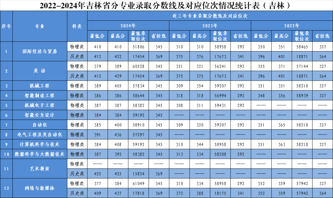 本期带来我校《2022-2024年吉林省分专业录取分数线及对应位次情况统计表》。