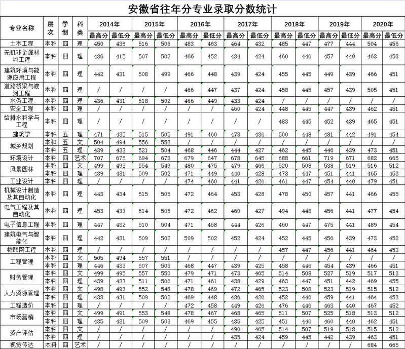 我校各招生专业往年在安徽省录取的最高分和最低分汇总表(2014-2020年)
