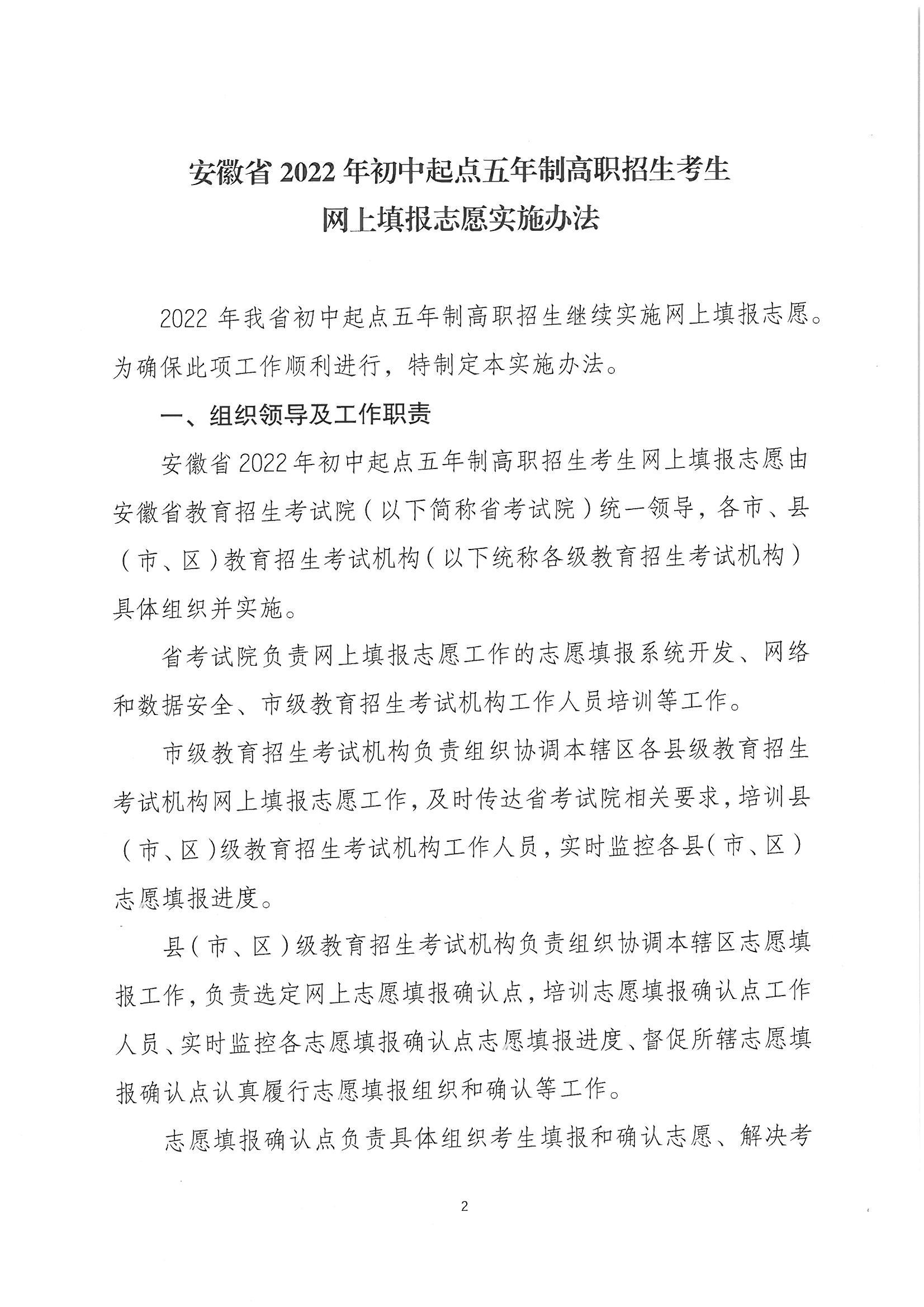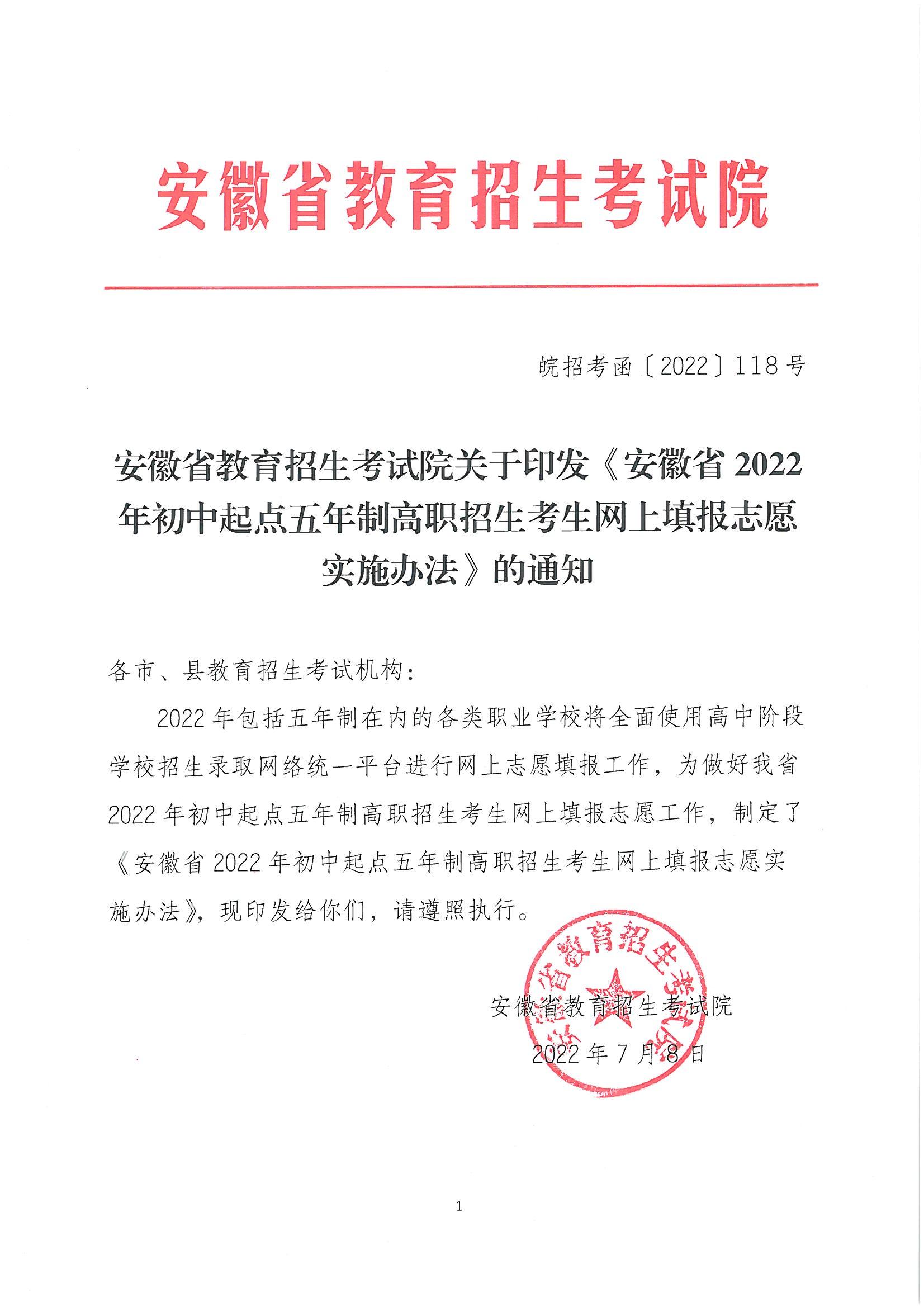 安徽省教育招生考试院关于印发《安徽省2022年初中起点五年制高职招生考生网上填报志愿实施办法》的通知