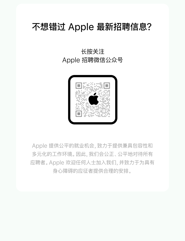 正文:在这里,各种领域的人才都能大有所为。加入我们的团队,在工作中相互成就。不妨探索一下,看看哪些团队更符合你的兴趣,让你一展所长。六月热招职位。运营与供应链。执行非同凡响的标准,满足非比寻常的期待。左滑查看更多。上海,机器学习工程师,Machine Learning Engineer。仓储管理经理,Finished Goods Distribution Centre Manager。物料管理项目经理,Materials Program Manager。应用程序开发经理,Web Application Development Manager。查看更多职位详情。上海,软件工程经理,Software Engineering Manager。高级软件工程师(机器学习运维),Senior Software Engineer (MLOps)。深圳,产品质量工程师 - iPad,Product Quality Engineer - iPad。设备项目管理,CapEx Operations Program Manager。新产品项目经理,NPI Operations Program Manager。查看更多职位详情。深圳,表面处理主题问题专家,Subject Matter Expert - Surface Finishing。塑胶模具工程师,Plastic Tooling Engineer。制造质量保证工程师,Manufacturing Quality Assurance。上海,深圳,全球供应链管理,Enclosure Global Supply Manager。查看更多职位详情。苏州,制造设计工程师 - 柔性印刷电路组件,DFM Engineer - Flex Assembly / FPCA。制造设计工程师 - 刚性印刷电路板组装,DFM Engineer - Rigid PCBA。深圳,苏州,先进制造工程师,Advanced Manufacturing Engineer。查看更多职位详情。深圳,苏州,长沙,制造工艺工程师,Manufacturing Design Engineer。供应商质量工程师,Manufacturing Quality Engineer。查看更多职位详情。软件和服务。对我们来说,用户体验其实就是人的体验。左滑查看更多。北京,Homekit 测试软件开发工程师,Homekit Software Developer in Test。蜂窝软件集成测试高级工程师,Sr. Cellular Software Integration Test Engineer。蜂窝软件开发工程师 - 工厂,Cellular Software Development Engineer - Factory。查看更多职位详情。上海,运维工程师,Wallet, Payments and Commerce - Site Reliability Engineer。客户伙伴经理,Client Partner, Leisure。技术集成专家,Technical Integration Specialist。客户战略经理,广告业务,Client Strategist Manager, Ad Platforms。查看更多职位详情。硬件,别人眼中的终点,正是我们最喜欢的起点。左滑查看更多。上海,摄像头量测工程师,Camera Metrology Technologist。无线系统工程师,Wireless System Engineer。北京,算法工程师,摄像头算法,Machine Learning Engineer, Camera Algorithms。深圳,声学工程师,Acoustics Engineer。查看更多职位详情。上海,深圳,触控硬件电路设计工程师,Touch Integration Electrical Engineer。射频工程师,Product RF Design Engineer。产品设计工程师,Product Design Engineer。系统电子工程师,System Electrical Engineer。技术项目管理,Engineering Project Management。查看更多职位详情。机器学习与人工智能,工作无限创新,体验非比寻常。左滑查看更多。北京,机器学习工程师 - 数据与机器学习创新团队,Machine Learning Engineer, Data & Machine Learning Innovation。资深数据科学家,Sr. Data Scientist, Data and Machine Learning Innovation。上海,数据标注师(普通话),Data Operations Annotation Analyst (Mandarin)。数据标注运营经理,Data Operations Annotation Team Lead。查看更多职位详情。北京,上海,机器学习工程师 - Siri 及信息智能团队,Machine Learning Engineer - Siri and Information Intelligence。Siri NLP 工程师 - Siri 及信息智能团队,Siri NLP Engineer - Siri and Information Intelligence。基础架构系统工程师,Infrastructure Systems Engineer。查看更多职位详情。销售与业务发展,打开人与人之间的无限可能。左滑查看更多。北京,经济学家 / 核心数据科学家,Economist / Core Data Scientist。机器学习工程师,Machine Learning Engineer。查看更多职位详情。公司职能部门,运营一家出色的公司,离不开一众出色的人才。左滑查看更多。上海,软件测试工程师,Software Engineer Manager in Test。高级前端软件工程师,Senior Software Engineer Frontend。零售工程项目经理,Retail Engineering Project Manager。查看更多职位详情。北京,中国区注册事务负责人,Head of China Regulatory Affairs。软件工程经理,人工智能和数据平台,Software Engineering Manager, Ai & Data Platforms。查看更多职位详情。Apple 零售,将每一份热爱都融入工作。左滑查看更多。销售相关,北京,长沙,成都,重庆,福州,广州,杭州,济南,南京,南宁,宁波,青岛,上海,沈阳,深圳,苏州,无锡,厦门,郑州,Specialist 专家,Specialist。查看更多职位详情。支持与服务,为别人解决一些难题,为自己增添一份快乐。左滑查看更多。上海,销售经理,零售顾客服务团队,Sales Area Manager, Retail Customer Care。顾客服务专家,零售顾客服务团队,Customer Service Support Specialist, Retail Customer Care。供应商管理, 零售顾客服务团队,Vendor Manager, Retail Customer Care。查看更多职位详情。查看 Apple 招贤纳才官方网站所有团队热招职位,点击前往。更多精彩内容。Apple 零售招聘团队线上分享会,6月11日和6月25日,立即报名。不想错过 Apple 最新招聘信息?长按关注,Apple 招聘微信公众号。二维码。Apple 提供公平的就业机会,致力于提供兼具包容性和多元化的工作环境。因此,我们会公正、公平地对待所有应聘者。Apple 欢迎任何人士加入我们,并致力于为具有身心障碍的应征者提供合理的安排。