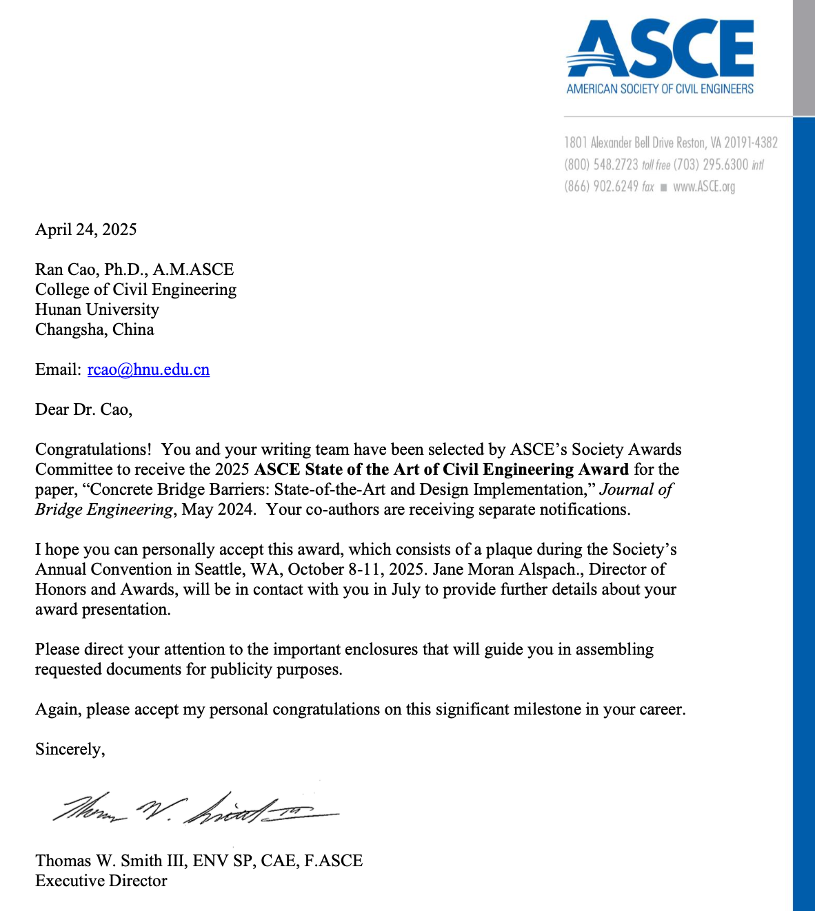 近日,土木院曹然副教授荣膺美国土木工程师学会(ASCE)“土木工程前沿奖”(State-of-the-Art of Civil Engineering Award),以表彰其在国际权威期刊《ASCE Journal of Bridge Engineering》上发表的综述论文《Concrete Bridge Barriers: State-of-the-Art and Design Implementation》在结构抗撞设计领域所做出的突出贡献。