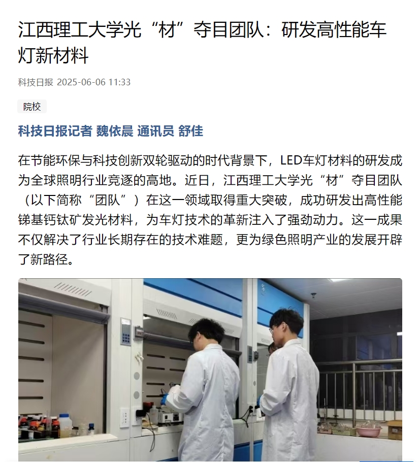 在节能环保与科技创新双轮驱动的时代背景下,LED车灯材料的研发成为全球照明行业竞逐的高地。近日,江西理工大学光“材”夺目团队(以下简称“团队”)在这一领域取得重大突破,成功研发出高性能锑基钙钛矿发光材料,为车灯技术的革新注入了强劲动力。这一成果不仅解决了行业长期存在的技术难题,更为绿色照明产业的发展开辟了新路径。
