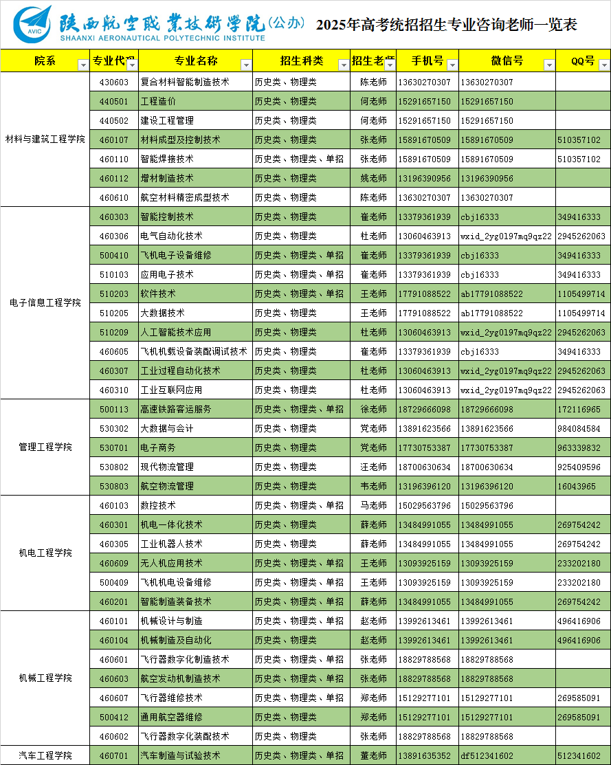 陕航职院2025年高考统招招生专业咨询老师一览表