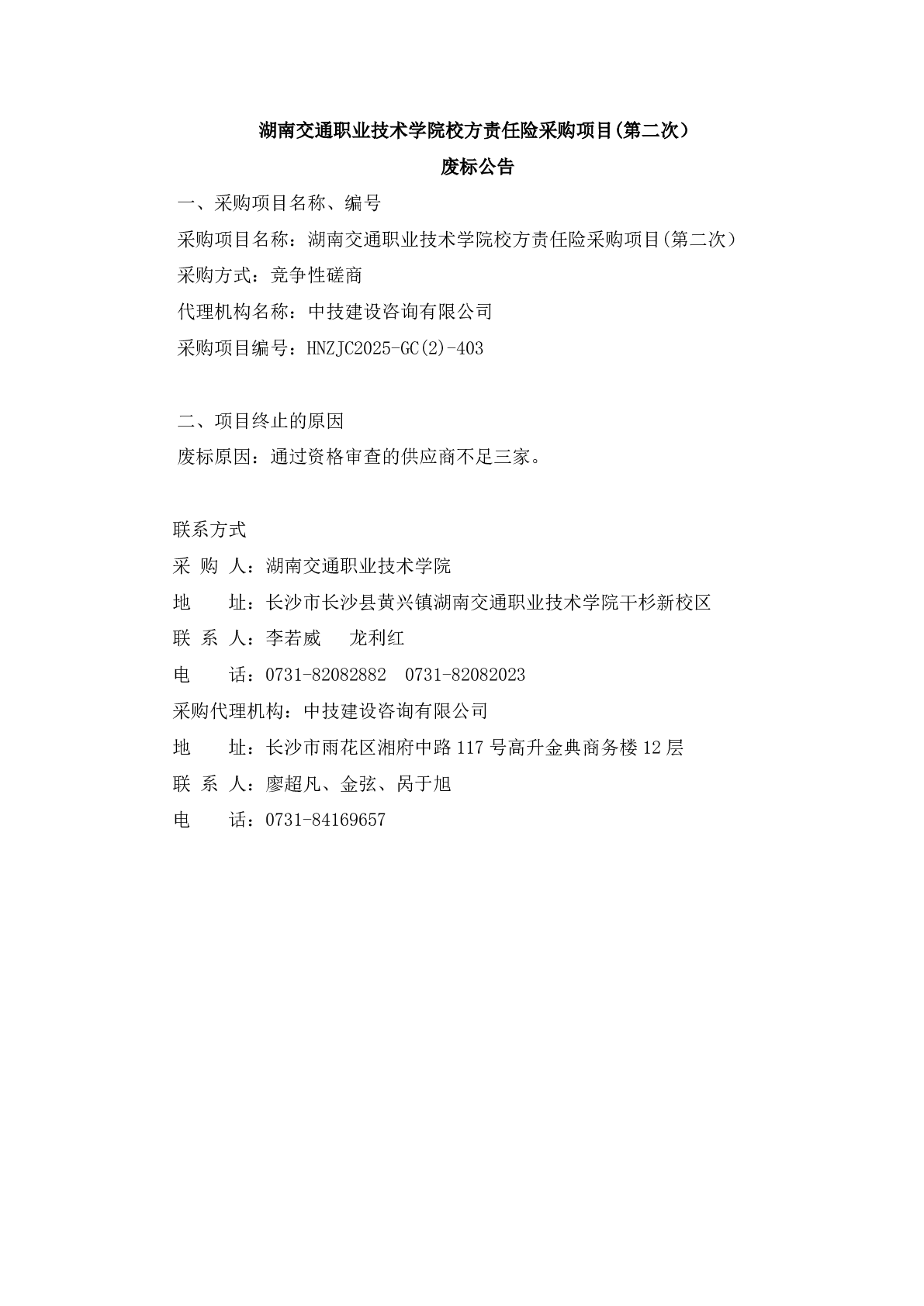 湖南交通职业技术学院校方责任险采购项目(第二次)废标公告