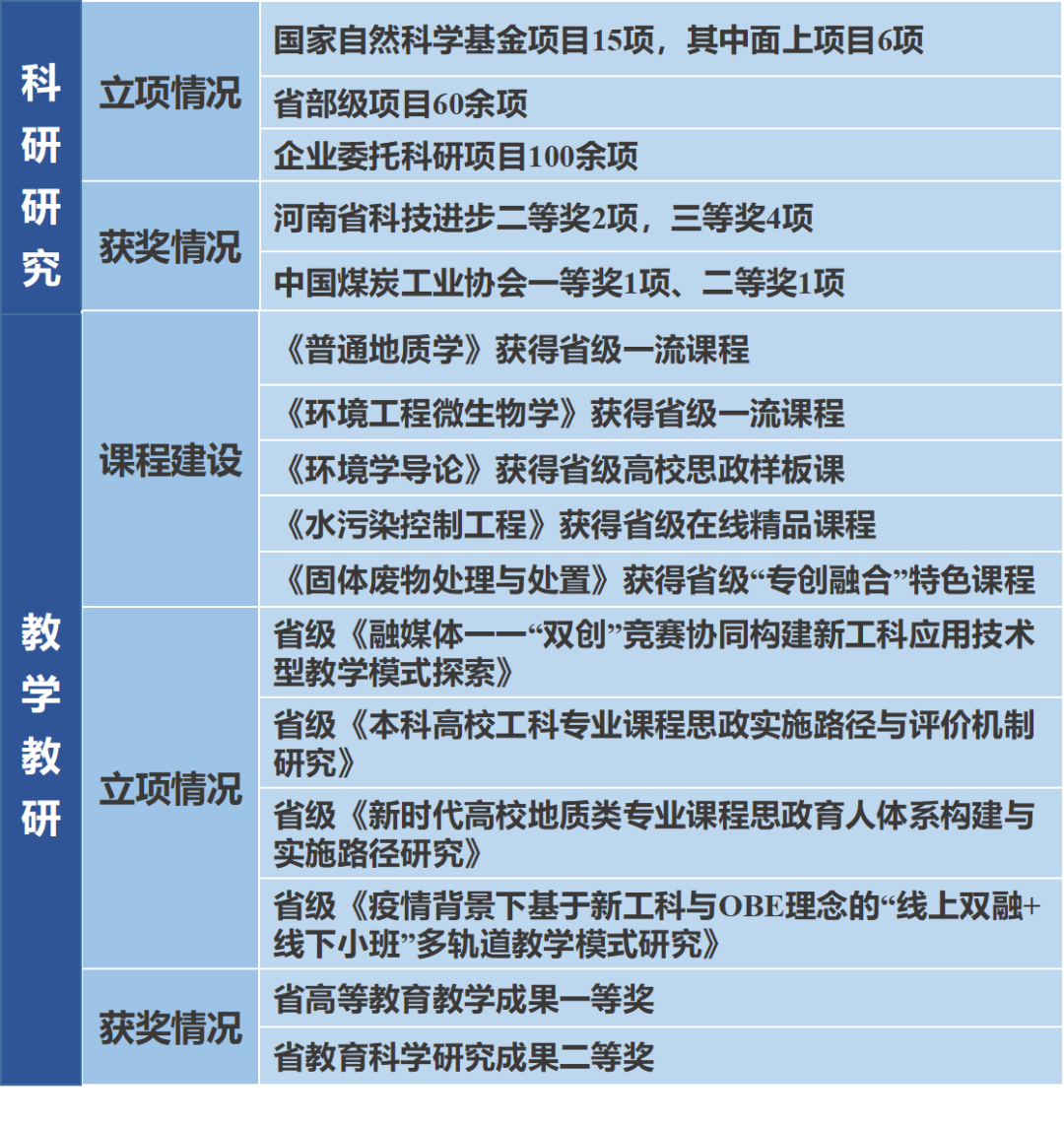 学院办学历史悠久,其前身可追溯至1980年初成立的郑州煤田职工地质学院地质系。经过四十余年的建设与发展,逐步形成了特色鲜明的办学体系,以资源与环境学科(河南省重点学科)为引领,带动环境工程、资源勘查工程、数据科学与大数据技术(数字生态方向)等5个本科专业协同发展。在师资队伍建设方面,学院现有教职工72人,其中教授6人,副教授21人,包括博士生导师1人、硕士生导师10人,具有博士学位的教师占比64%。在人才培养方面,取得显著成效,考研率平均40%以上,就业率平均90%以上。