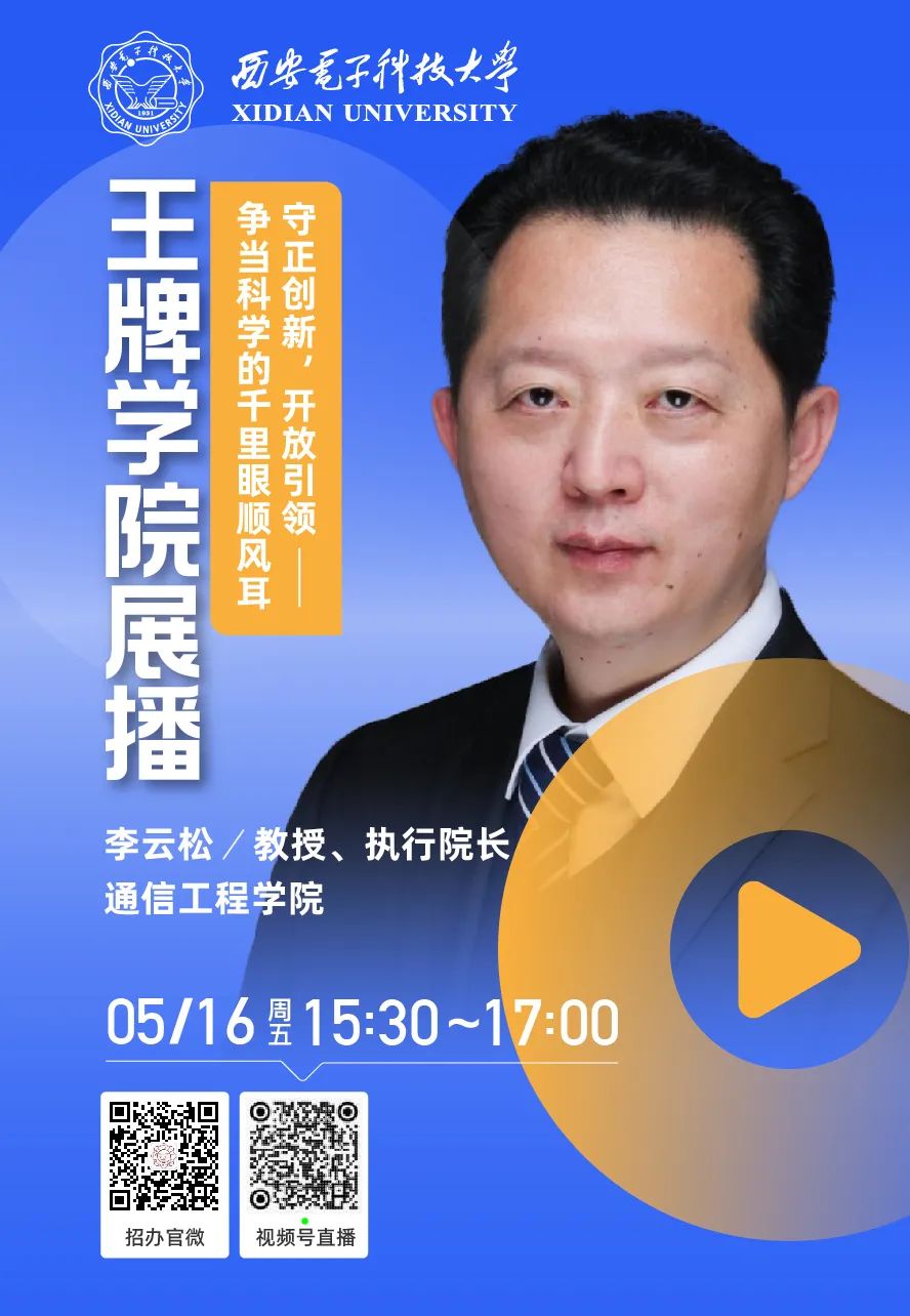 2025“王牌学院展播”活动第三期将于5.16(星期五)开讲!本期邀请到西电通信工程学院执行院长李云松教授,带我们解读通信工程的奥秘,欢迎各位家长及考生关注~