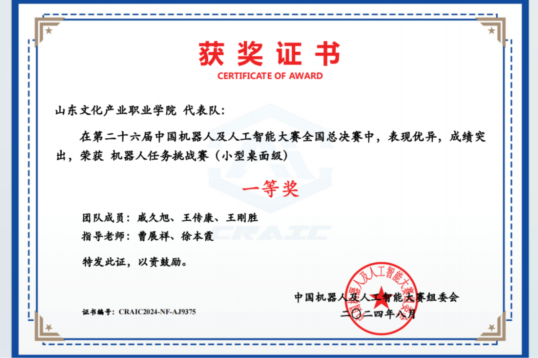 第二十六届中国机器人及人工智能大赛全国总决赛荣获一等奖