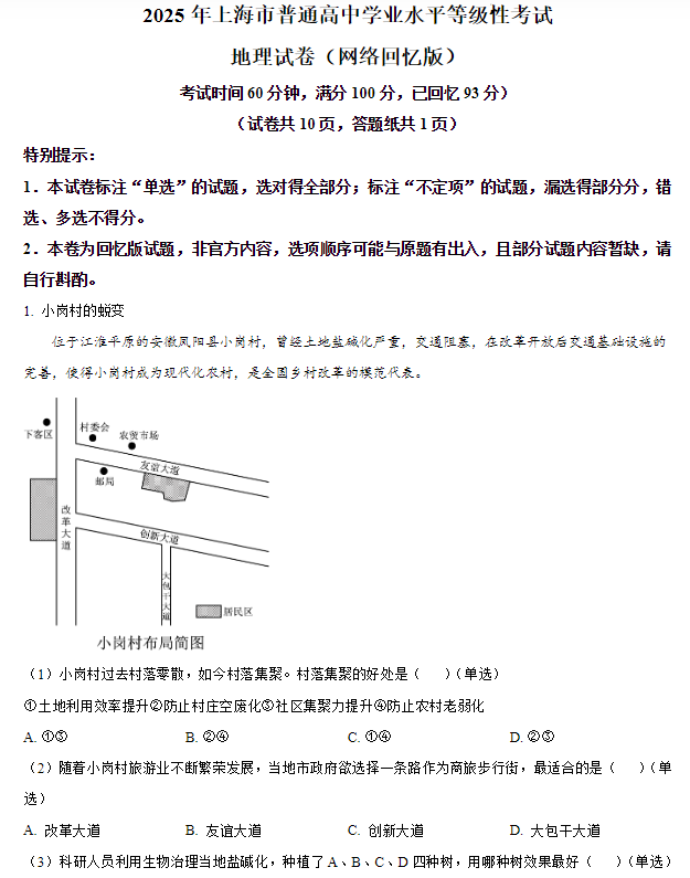2025年上海普通高中学业水平等级性考试地理真题