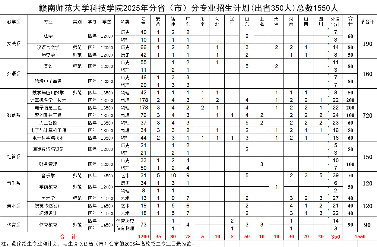 赣南师范大学科技学院2025年分省(市)分专业招生计划