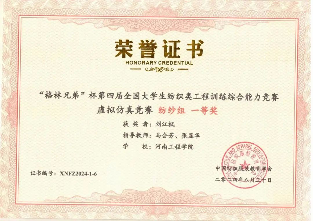 虚拟纺织竞赛纺纱组一等奖