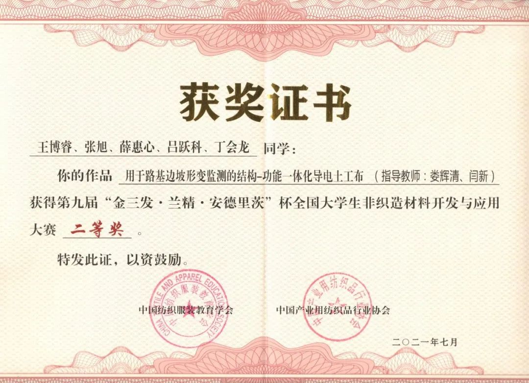 全国大学生非织造材料开发与应用二等奖