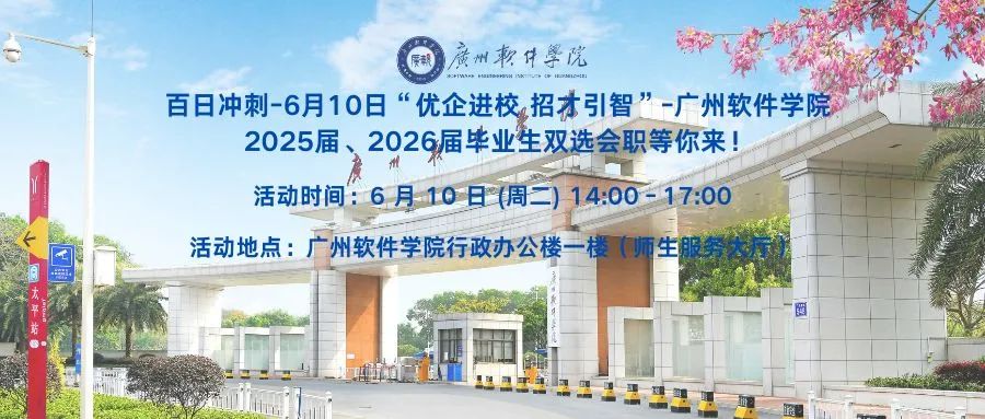 亲爱的2025届、2026届毕业生们,准备好了吗?一场专属于你们的求职盛宴即将开启!6月10日,广州软件学院新行政楼一楼将迎来“优企进校 招才引智”专项行动广州软件学院2025届、2026届毕业生双选会!这是一场汇聚名企、岗位多样、机会无限的招聘盛会,助你开启职业生涯的第一步!