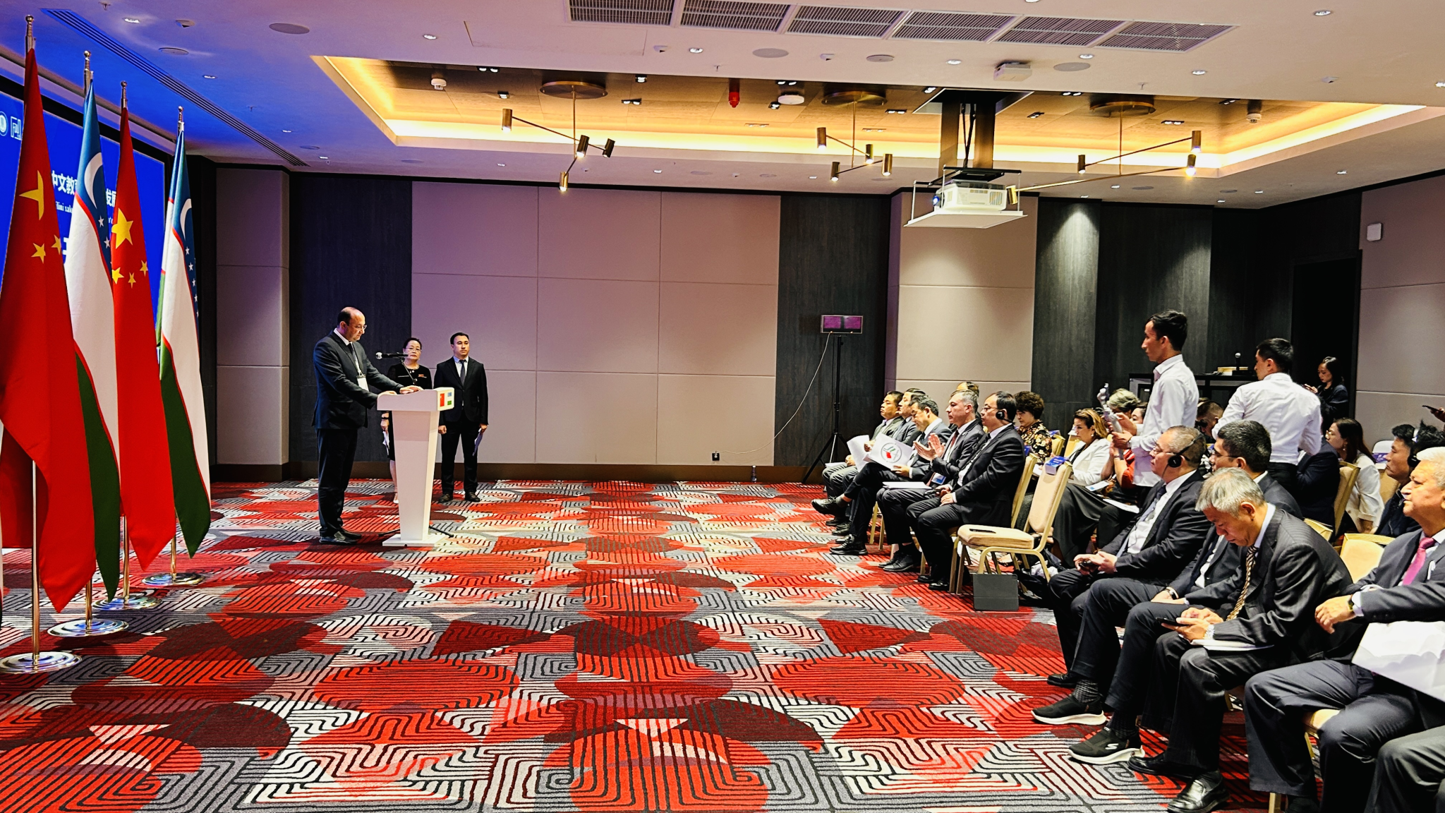 与会期间,常江分别与乌兹别克斯坦高等教育、科学与创新部长沙里波夫、卡什卡达里亚州副州长奥利姆洪·鲁斯塔莫夫及布哈拉工程技术大学、撒马尔罕国立科技大学、萨马尔罕国际学院等学校领导进行了友好交流。开幕式签约后,与乌方教育部、能源部就共建乌兹别克斯坦分校工作召开了三方现场座谈会,并分别参加了国际中文教育高质量发展论坛、国际交通领域人才培养论坛。