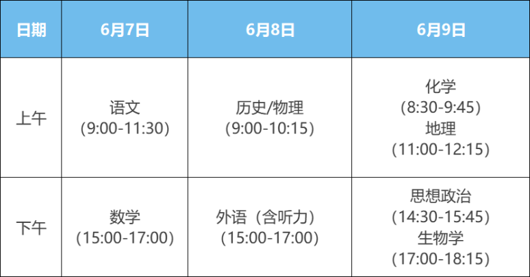特别提醒:考生可在考前40分钟(语文科目为考前45分钟)于考场前门入口处排队等候,依次进入考场。各科目开考15分钟后(外语科目14时45分后)考生不得进入考点参加当次科目考试。语文、数学、外语3门科目交卷出场时间均不得早于考试结束前30分钟,交卷出场后不得再进场续考,也不得在考场附近逗留或交谈;物理、历史、化学、地理、思想政治、生物学6门科目不得提前交卷。